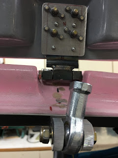 Battery tray/bellcrank mount placed back in position. The right side of the battery tray (top side in picture) has been removed so that I can now extend the tray out to the limits of the supports. Front and back rails also to be fabricated to the new width.